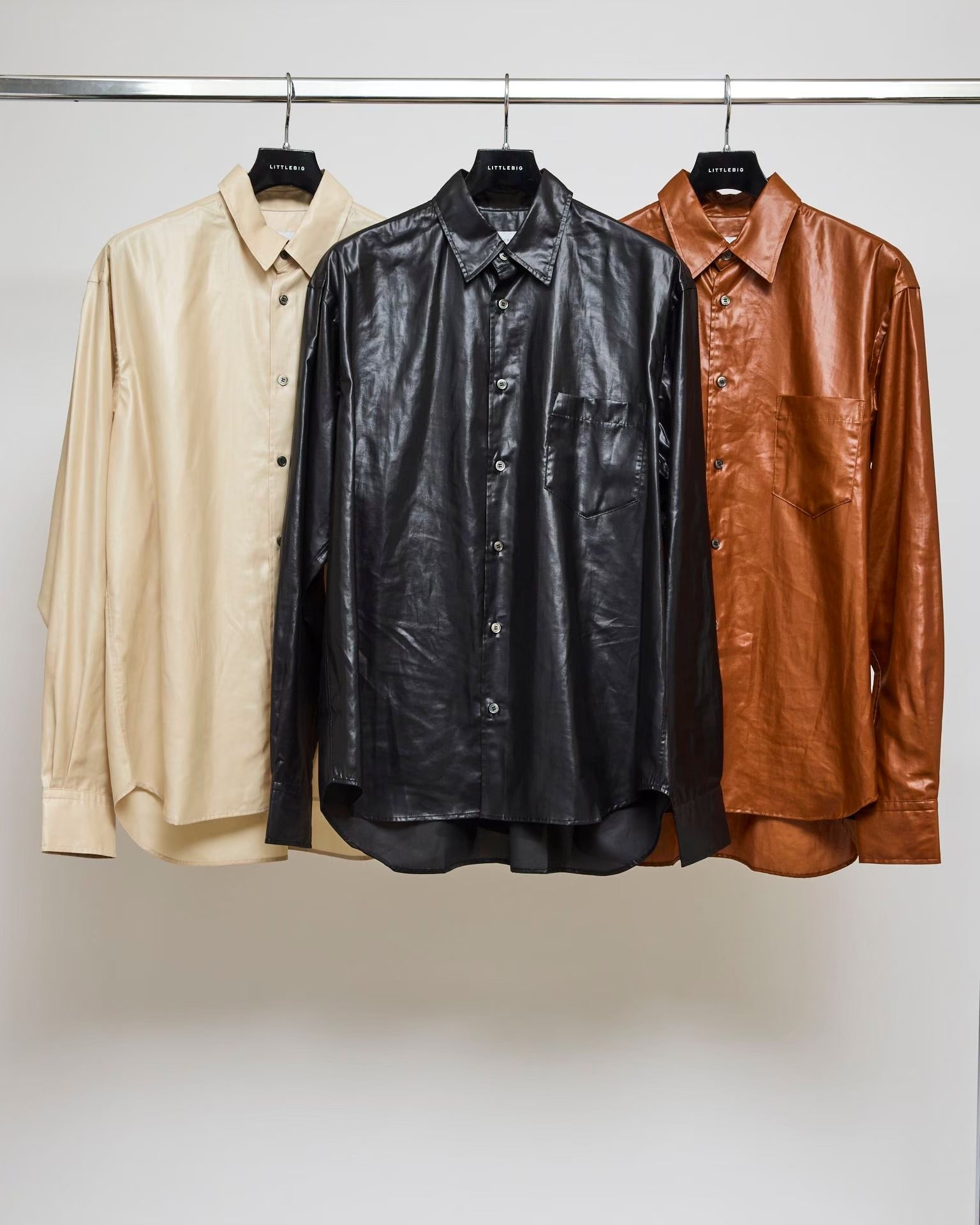 - A leather-like, glossy coated shirt